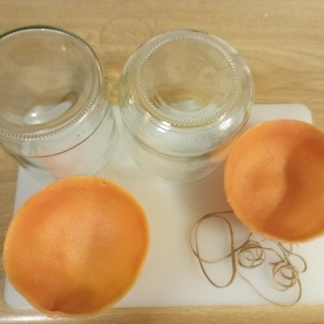 Update: I got some big marsh grapefruit (absolute units) and I've started my next box. I forgot to photograph the start of the process, but you know what a grapefruit looks like. This time it actually was easier to scrape off the pith after soaking (I cleaned up some remaining scraggly bits with a spoon before inverting). I forgot to mention that you should use a tea towel to blot most of the moisture out at the end. My little jars were dwarfed by these skins, so I had to use bigger ones -- I found two with no concave curves at the bottom that were very slightly different sizes; I'll see how the halves fit together.